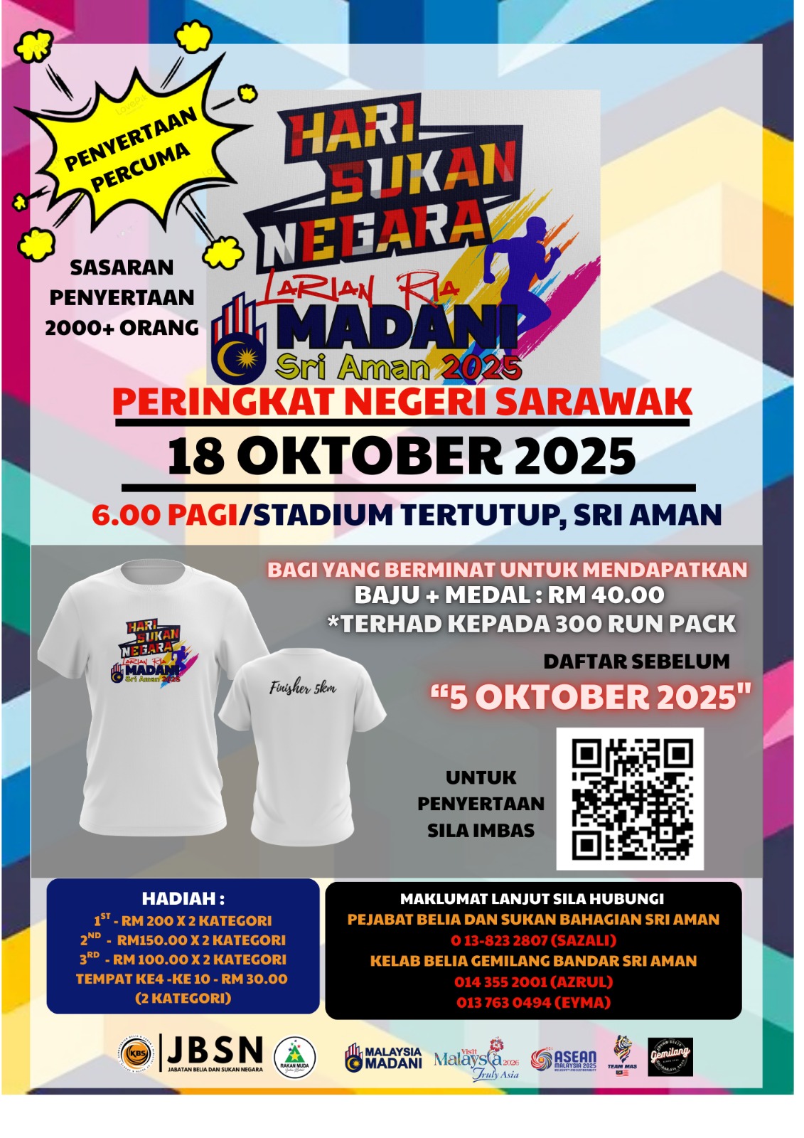 Penyertaan adalah PERCUMA dan terbuka kepada semua lapisan masyarakat tanpa mengira had umur dan jantina. Hadiah wang tunai disediakan kepada pemenang sehingga tempat ke-10 bagi kedua-dua kategori larian (Lelaki/wanita). Bagi yang berminat untuk mendapatkan T-shirt larian HSN2025 dan Medal bayaran sebanyak RM40.00 dan dikehendaki mendaftar penyertaan sebelum 5 Oktober 2025. Sebarang pertanyaan dan maklumat lanjut boleh berhubung dengan Azrul/0143552001 atau Eyma/0137630494 (Kelab Belia Gemilang Bandar Sri Aman)