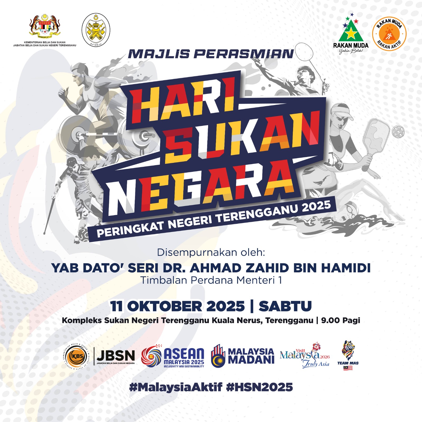 Jom bersukan!!! Hari Sukan Negara kembali lagi! Mari kita semarakkan gaya hidup sihat & aktif untuk diri, keluarga dan Negara. HSN 2025 kali ini menawarkan pelbagai aktiviti bersukan secara PERCUMA. Kayuhan Madani Larian Ria Madani Jalan Kaki Santai Madani. Pendaftaran : https://forms.gle/eFtXA7q9jrmSEj4d9 Untuk peserta 'FUN WALK/FUN RUN anda perlu join Telegram kami bagi mengetahui maklumat lanjut berkaitan hari program https://t.me/+1T_EOnqlnUA1N2Jl Bagi yg berminat untuk mmbeli baju rasmi HSN boleh tekan link https://forms.gle/NEjhvunxXiytN8pv9 Sebarang pertanyaan berkaitan baju boleh hubungi https://www.wasap.my/60148581244/BajuHSN2025 Sambutan Hari Sukan Negara 2025 Peringkat Negeri Terengganu akan dirasmikan oleh oleh *YAB Timbalan Perdana Menteri 1* pada 11 Oktober 2025 (Sabtu) di Kompleks Sukan Kuala Nerus, Terengganu. Jom tengok dan pilih sukan sesuai untuk anda! Dapatkan Baju dan Medal Edisi Terhad sempena HSN 2025 di bumi Terengganu. Terengganu dok rilek!!! #JBSNKomited #MalaysiaMadani #KBSMalaysia #TeamJBSN #TeamJBSNT #rakanmuda #HSNTerengganu2025 #HSN2025 #MalaysiaAktif