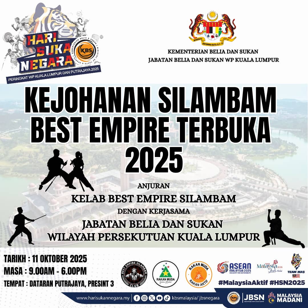Kejohanan Silambam Best Empire Terbuka 2025Sempena Hari Sukan Negara 2025, Kelab Best Empire Silambam dengan kerjasama Jabatan Belia dan Sukan Wilayah Persekutuan Kuala Lumpur akan menganjurkan Kejohanan Silambam Best Empire Terbuka 2025. Seramai 200 peserta berumur 7 hingga 16 tahun akan mengambil bahagian dalam kategori Kombat (Poruthal), Kai Salavarisaidan Ottrai Kambu Thanithiramai. Program ini bertujuan memupuk semangat kesukanan, memperkenalkan seni mempertahankan diri tradisional Silambam, serta menggalakkan penyertaan belia dan kanak-kanak dalam aktiviti berfaedah. #HariSukanNegara2025 #HSN2025 #KejohananSilambam2025 #BestEmpireSilambam #Silambam#SemangatKesukanan #AnakMudaAktif #SukanUntukSemua
