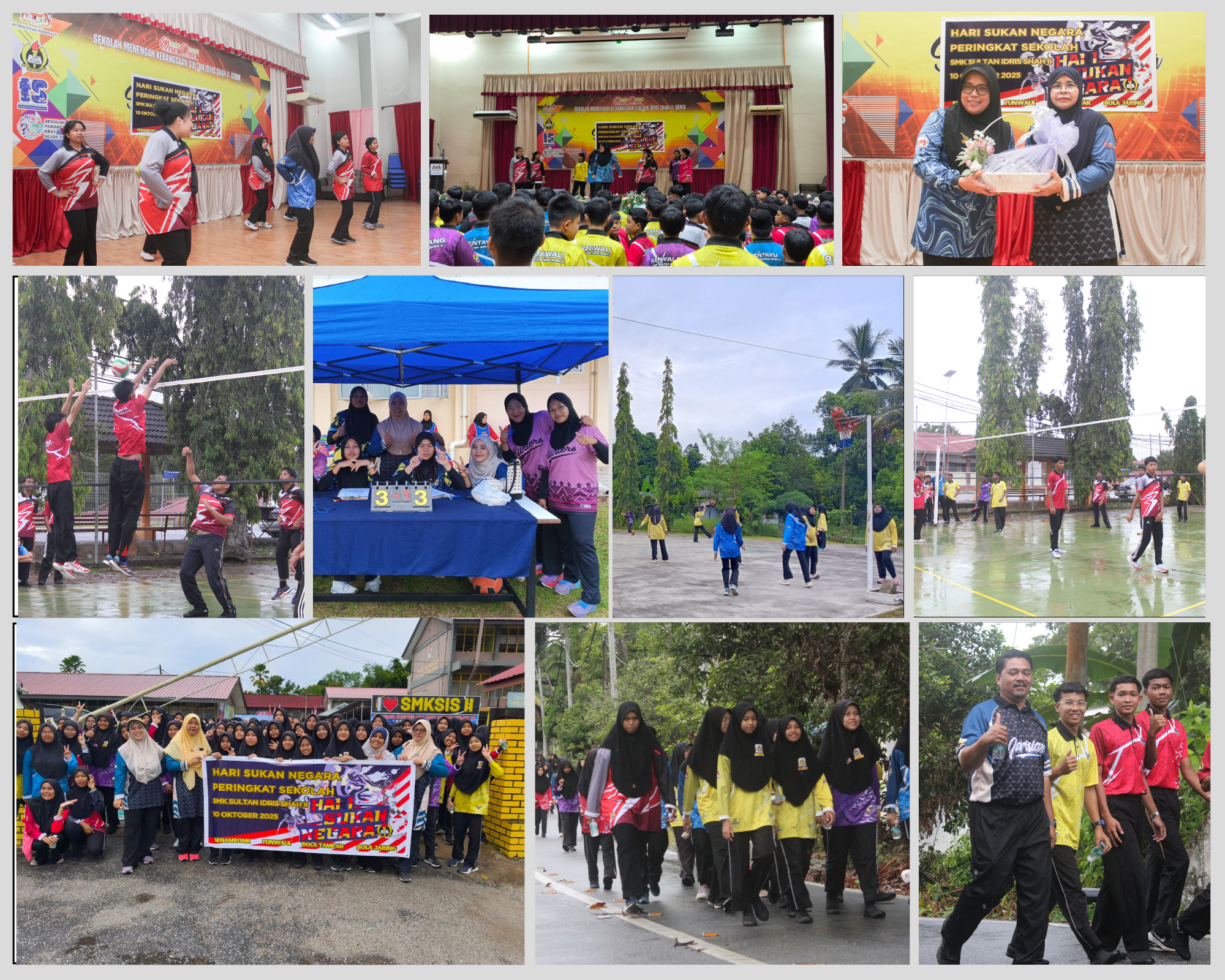 BUTIRAN PELAKSANAAN PROGRAM Tarikh : 10 Oktober 2025 Tempat : SMK Sultan Idris Shah II Gerik Masa : 7.00 – 10.00 Pagi ATURCARA PROGRAM MASA AKTIVITI 7.00 – 7.30 Pagi Pendaftaran peserta 7.30 – 7.45 Pagi Senamrobik 7.45- – 9.40 Pagi Funwalk, Bola tampar Lelaki antara Rumah, Bola Jaring Perempuan antara Rumah 9.30 – 10.00 pagi Majlis Penutup dan Penyampaian Hadiah JAWATANKUASA KERJA Pengerusi Pn Hjh Azizah binti Ariffin (Pengetua SMKSIS II) Timbalan Pengerusi En. Daniel bin Harun PK Kokurikulum SMKSIS II Naib Pengerusi En. Abdul Aziz bin Arsyad (PK Hal Ehwal Murid) Setiausaha En. Mohamad Hasnan bin Ab Rahman Bendahari Pn. Noor Akhmalia binti Mat Isa JAWATANKUASA PELAKSANA HARI SUKAN NEGARA PERINGKAT SEKOLAH 2025 Bil Senarai Tugas Skop Tugas 1 Pendaftaran Peserta (Murid) Semua Guru Tingkatan Guru & Staf Pn. Siti Noor binti Mohd Zin Cik Nur Syamimi Mifdhal Binti Mohd Hanif 1. Memastikan semua peserta telah didaftarkan. 2. Merekod jumlah kehadiran 2 Displin En. Wan Muhammad bin Wan Abdullah En. Fakhrul Anuar bin Saadon @ Saadan 1. Memastikan displin pelajar terkawal. 3 Surat & Jemputan Pn. Noros Shahada binti Wan Ismail 1. Menguruskan surat jemputan kepada instruktor senamrobik 2. Menghantar surat makluman kepada polis 4 Hadiah dan Cenderamata Cik Hanim Syafika binti Salimy Cik Nor Jamilah Binti Mohd Fazil 1. Menguruskan hadiah untuk pemenang. 2. Menyediakan cenderamata kepada Instruktor senamrobik. 6 Persiapan Tempat / Peralatan (padang) En. Muhammad Khairullah bin Ibrahim 1. Membuat persiapan tempat awal sebelum pelaksanaan aktiviti 2. Menyediakan peralatan yang diperlukan 7 Penyelia/Penyelaras Peserta En. Muhammad Hasnan bin Ab Rahman Pn. Nurfiza binti Abd Razak 1. Memastikan peserta berkumpul dan mendengar arahan perjalanan aktiviti 2. Mengawal peserta di padang. 9 Makan Minum Pn. Jamaliah binti Abdul Hamid Pn. Rohani binti Rajab 1. Meyediakan makan dan minum VIP selepas acara senamrobik. 2. Memastikan hidangan mencukupi 10 Bacaan Doa En. Mohd Saiful Lizam bin Abdul Rahim 1. Bacaan Doa selemat sebelum aktiviti Funwalk dilepaskan 11 Pengacara Majlis Pn. Anis Farhana binti Azham 2. Menyediakan teks majlis 3. Memastikan majlis berjalan lancar 4. Menyediakan salutasi. 12 Pemplet Pn. Zairil Hana binti Hamdan 1. Buku program/pamplet cetakan atau QR Code 13 Siaraya (Dewan/Padang) En. Mohd Hafizuddin bin Abdullah En. Mohamad Shukri bin Che Noh 1. Memastikan PA berfungsi dengan baik 2. Menyediakan audio bersesuaian untuk senamrobik dan majlis penutup 14 Fotografi dan Dokumentasi Cik Nurul Aina binti Muhammad K.Y. Tiang Pn Syahidatul Ikma binti Halim 1. Mengambil gambar semasa aktiviti dijalankan 2. Menyediakan pelaporan 15 Pertandingan Bola Tampar Lelaki dan Bola Jaring Perempuan Ketua Penasihat Rumah Sukan Pn. Siti Aishah binti Amirkadra (Bola Tampar) En. Mohd Azizi bin Mohd Amin Pn Aida Syafiza binti Mohd Zaki (Bola Jaring) Pn Nurafiza bintiAbd Razak (Bola Jaring) 1. Menyediakan pasukan yang mewakili setiap kelas (Tingkatan 3 sahaja) 2. Menyediakan tempat dan peralatan pertandingan. 3. Menguruskan pertandingan. 16 Aktiviti Fun Walk En. Mohd Norislam Faiz bin Che Ismail Tn. Hj. Amaluddin bin Abdullah 1. Menyediakan trek funwalk termasuk tanda arah dan kon 2. Menyelaras pelepasan peserta. 3. Memastikan kelancaran aktiviti. Link Galeri Gambar Galeri Gambar HSN SMKSIS2 2025