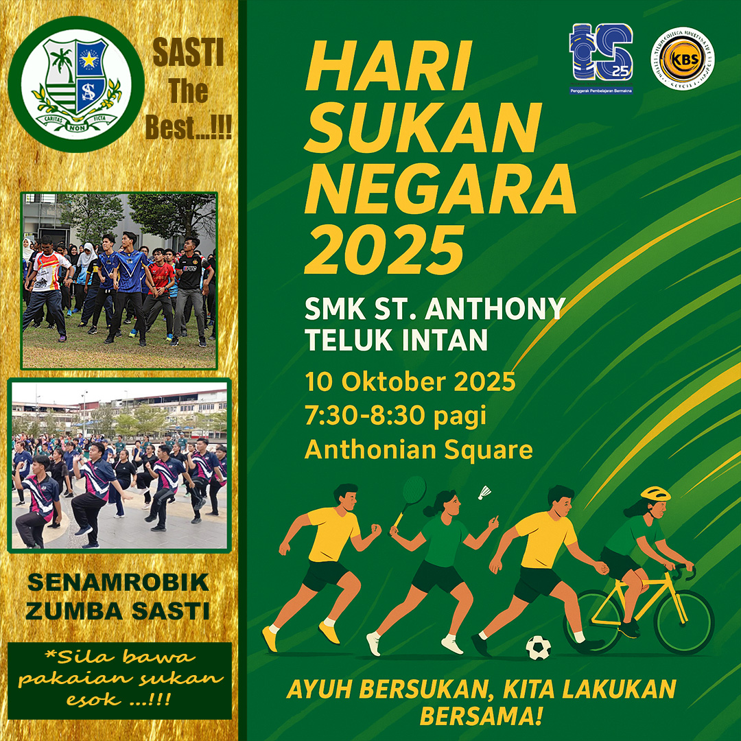 Senamrobik merupakan acara yang dipilih untuk dilaksanakan oleh SMK St. Anthony Teluk Intan bersempena Sambutan Hari Sukan Negara 2025 pada 10-13 Oktober 2025 seluruh Negara. SMK St. Anthony atau nama singkatannya "SASTI" merupakan sekolah di bawah Pendidikan Daerah Hilir Perak, Perak Darul Ridzuan. Acara yang dilaksanakan pada 10 Oktober hari jumaat, daripada 7.30 hingga 8.30 pagi, di Dataran Anthonian Square. Sambutan Hari Sukan SASTI disertai oleh warga sekolah, 58 orang guru dan 392 orang pelajar daripada tingkatan 1 hingga tingkatan 6. Beberapa pelajar tingkatan menjadi pengelola acara senamrobik tersebut bermula dengan renggangan, pemanasan badan dan diteruskan dengan tarian senamrobik sehingga ditutupi dengan senaman penutup. Pelajar dan guru dapat melibatkan diri bagi menyahut seruan kerajaan untuk mengamalkan gaya hidup sihat.