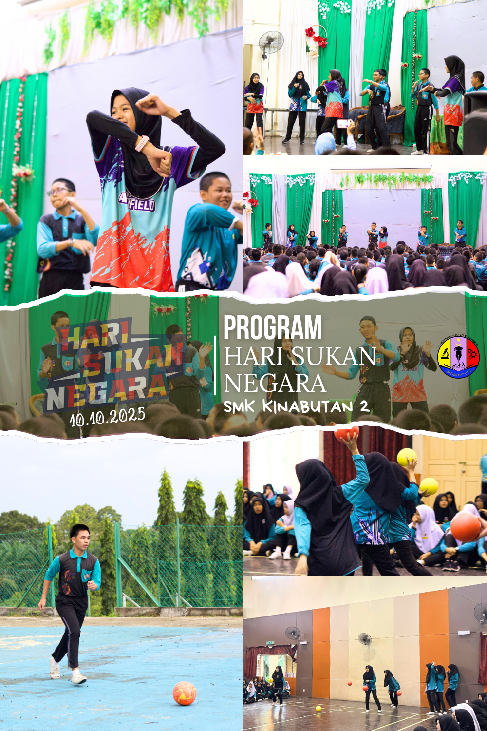 Hari Sukan Negara (HSN) adalah suatu sambutan tahunan yang bertujuan memupuk budaya bersukan dan gaya hidup aktif dalam kalangan rakyat Malaysia. Di peringkat sekolah, HSN memberi peluang kepada seluruh warga sekolah — murid, guru, kakitangan dan ibu bapa — untuk bersama-sama menyertai aktiviti fizikal dan sukan secara inklusif dan menyeronokkan. Melalui program ini, SMK Kinabutan 2 berhasrat: Meningkatkan kesedaran tentang kepentingan kecergasan fizikal dan kesihatan dalam kalangan warga sekolah. Menggalakkan penglibatan aktif dan semangat kesukanan di antara murid dan guru. Merapatkan hubungan antara warga sekolah (murid, guru, kakitangan, ibu bapa) melalui aktiviti bersama. Mendedahkan murid kepada pelbagai jenis aktiviti sukan — tradisional, moden dan rekreasi — supaya mereka boleh memilih yang sesuai dengan minat mereka. Memupuk nilai-nilai kerjasama, disiplin, toleransi dan semangat kesukanan. SMK Kinabutan 2 mempunyai kira-kira 832 murid dan 54 orang guru. Dengan kerjasama Unit Kokurikulum, Unit Sukan dan Jawatankuasa Murid, program ini akan dilaksanakan di padang sekolah dan kawasan sekitarnya pada tarikh yang ditetapkan.
