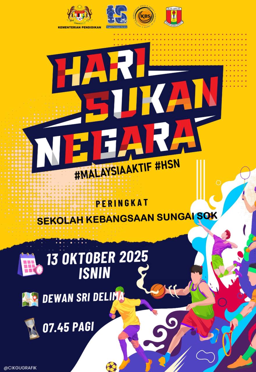 LAPORAN PROGRAM HARI SUKAN NEGARA PERINGKAT SEKOLAH 1. Pengenalan Program Hari Sukan Negara Peringkat Sekolah diadakan bagi menyahut seruan Kementerian Pendidikan Malaysia untuk memupuk semangat kesukanan serta menggalakkan gaya hidup sihat dalam kalangan murid, guru dan warga sekolah. 2. Objektif Program • Meningkatkan kesedaran tentang kepentingan bersukan untuk kesihatan. • Mewujudkan semangat kerjasama dan perpaduan antara murid serta warga sekolah. • Menggalakkan penyertaan aktif dalam aktiviti fizikal dan sukan. 3. Pengisian Aktiviti Antara aktiviti yang dijalankan sepanjang program ialah: • Senamrobik perdana • Sukaneka murid tahap 1 dan tahap 2 4. Penyertaan Program ini telah disertai oleh seramai 231 orang murid dan 21 orang guru. 5. Rumusan Secara keseluruhannya, Program Hari Sukan Negara Peringkat Sekolah telah berjalan dengan lancar dan mencapai objektif yang ditetapkan. Program ini berjaya memupuk semangat kesukanan, meningkatkan kecergasan fizikal serta mengeratkan hubungan silaturahim antara warga sekolah. Disediakan oleh: ⸻ (NURUL NURISYA BINTI MAT YUSOFF) Guru SU Kokurikulum, Sekolah Kebangsaan Sungai Sok