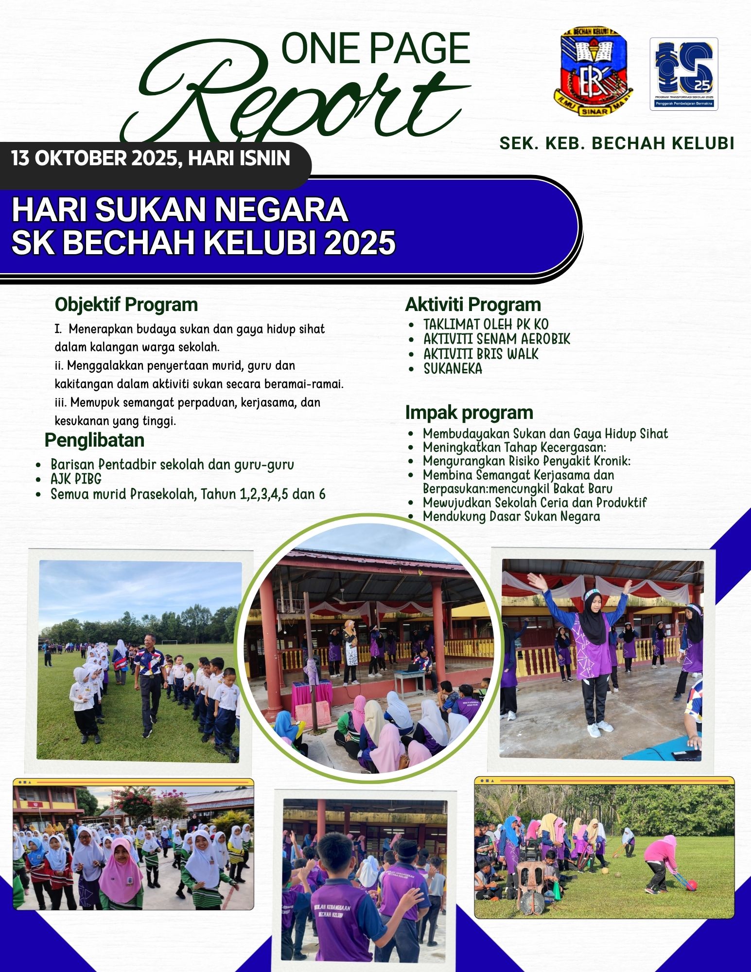 HARI SUKAN NEGARA SK BECHAH KELUBI 2025 (3) KEKUATAN PROGRAM Sambutan yang sangat menggalakkan daripada semua warga SK Bechah Kelubi, termasuk  murid-murid Tahap 1 dan 2]. Kerjasama yang erat antara guru, kakitangan, dan AJK PIBG dalam memastikan kelancaran program. Objektif program untuk membudayakan sukan tercapai dengan suasana ceria dan semangat kesukanan yang tinggi sepanjang hari. Secara keseluruhannya, Sambutan Hari Sukan Negara Peringkat SK Bechah Kelubi Tahun 2025 telah berjalan dengan jayanya, lancar, dan mencapai objektif yang disasarkan. Diharapkan program ini dapat menyuntik semangat dan motivasi kepada semua warga sekolah untuk terus mengamalkan gaya hidup sihat dan aktif.