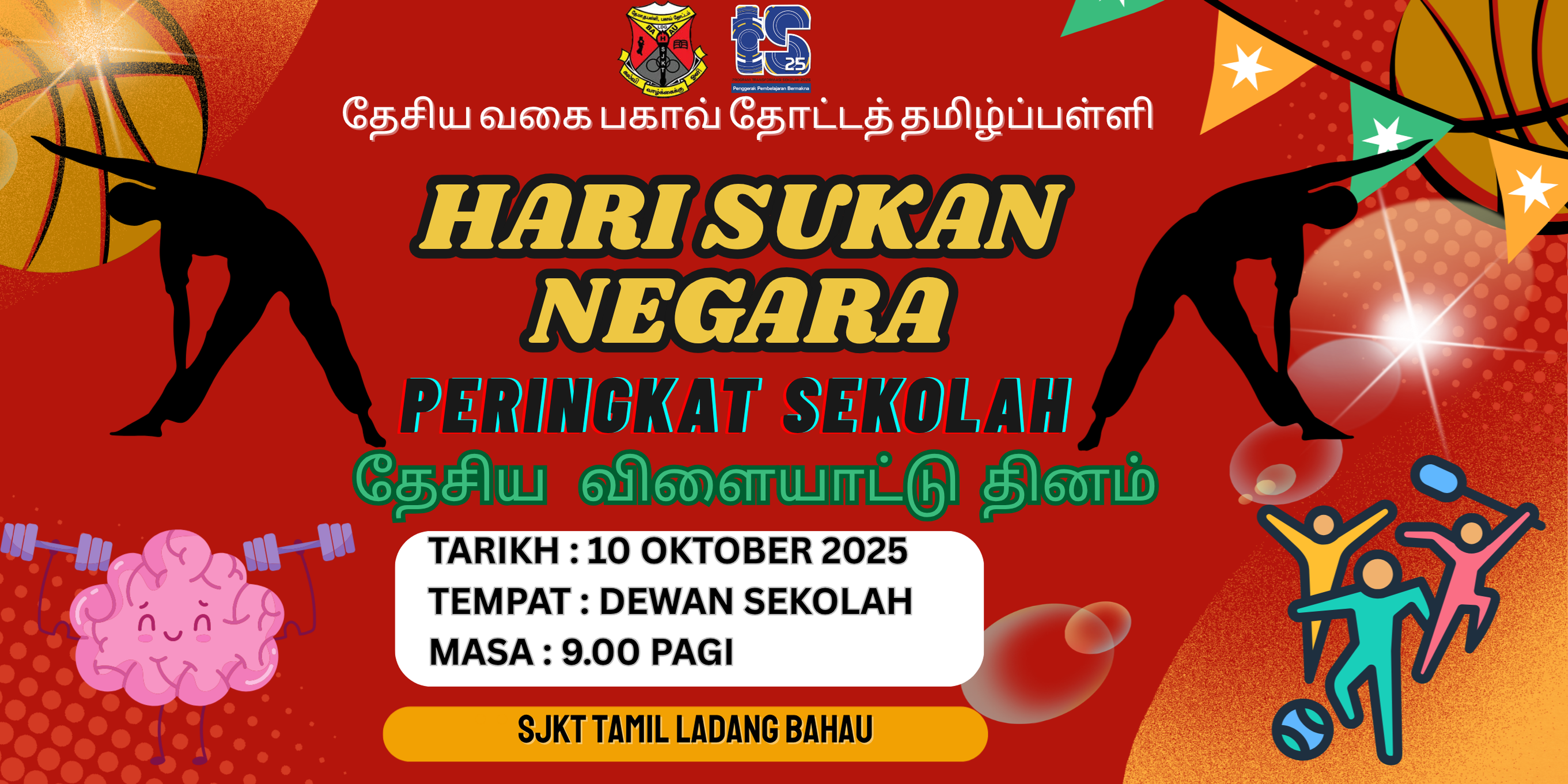 Sambutan Hari Sukan Negara Peringkat SJKT Ladang Bahau bagi tahun 2025 telah berjaya dilaksanakan dengan jayanya pada [Tarikh Penuh, contoh: 11 Oktober 2025]. Program ini diadakan selaras dengan inisiatif kerajaan untuk membudayakan sukan dan menggalakkan gaya hidup sihat dalam kalangan komuniti sekolah. Penyertaan melibatkan semua murid, guru, dan kakitangan sekolah.