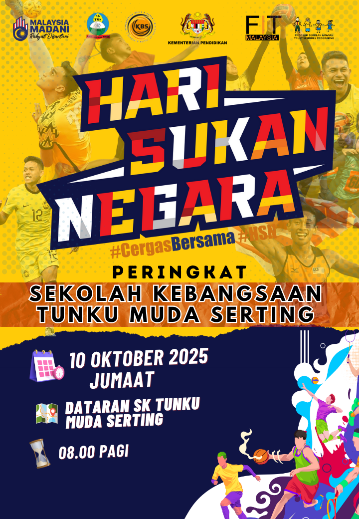 Hari Sukan Negara (HSN) merupakan inisiatif Kementerian Belia dan Sukan bagi memupuk gaya hidup sihat melalui aktiviti sukan dan kecergasan. Sehubungan itu, Sekolah Kebangsaan Tunku Muda Serting telah mengadakan sambutan Hari Sukan Negara peringkat sekolah pada 10 Oktober 2025 dengan pelbagai aktiviti menarik yang melibatkan semua warga sekolah.