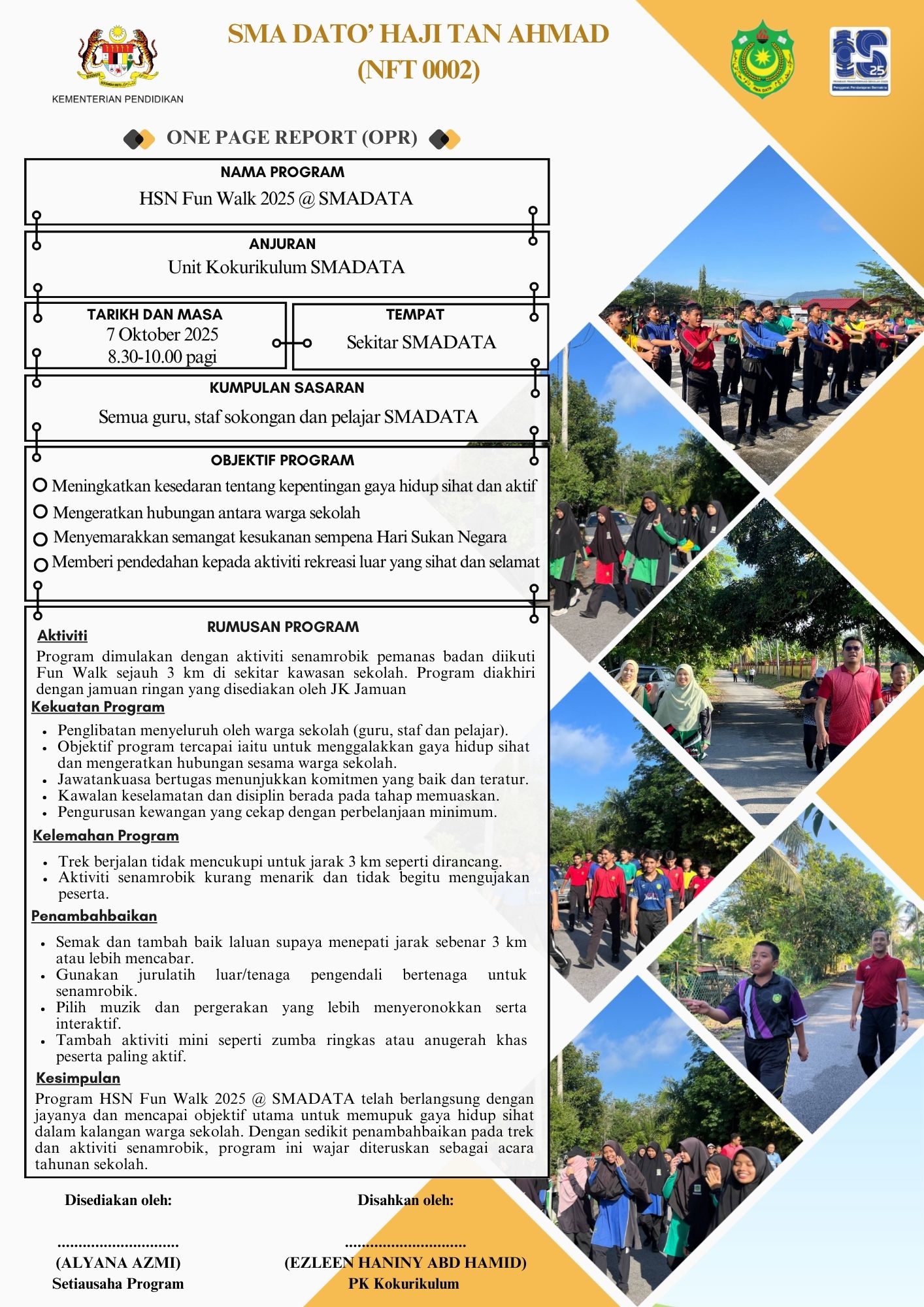 Program HSN Fun Walk 2025 @ SMADATA anjuran Unit Kokurikulum Sekolah Menengah Agama Dato’ Haji Tan Ahmad merupakan inisiatif bagi menyahut seruan Kementerian Belia dan Sukan (KBS) dalam usaha memupuk budaya hidup sihat dalam kalangan rakyat Malaysia, khususnya warga sekolah.