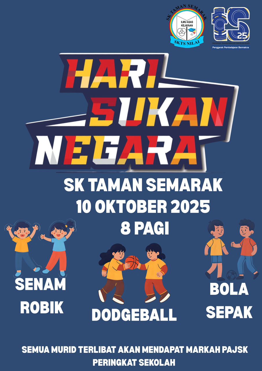 Sambutan Hari Sukan Negara peringkat SK Taman Semarak Nilai telah diadakan pada 10 Oktober 2025 bermula pukul 730 pagi. Sambutan ini disertai oleh 1270 orang peserta, termasuk murid tahun 1-6, murid pra-sekolah dan murid PPKI. Pertandingan bola sepak dan bola beracun telah dijalankan untuk murid sesi pagi manakala sukaneka telah dijalankan untuk murid sesi petang. Bagi murid pra-sekolah pula, mereka telah menyertai acara tarik bola guna gelung berhalangan dan junjung pundi kacang berhalangan. Satu perlawanan bola sepak antara murid-murid tahun 6 dan guru-guru lelaki juga telah berlangsung.