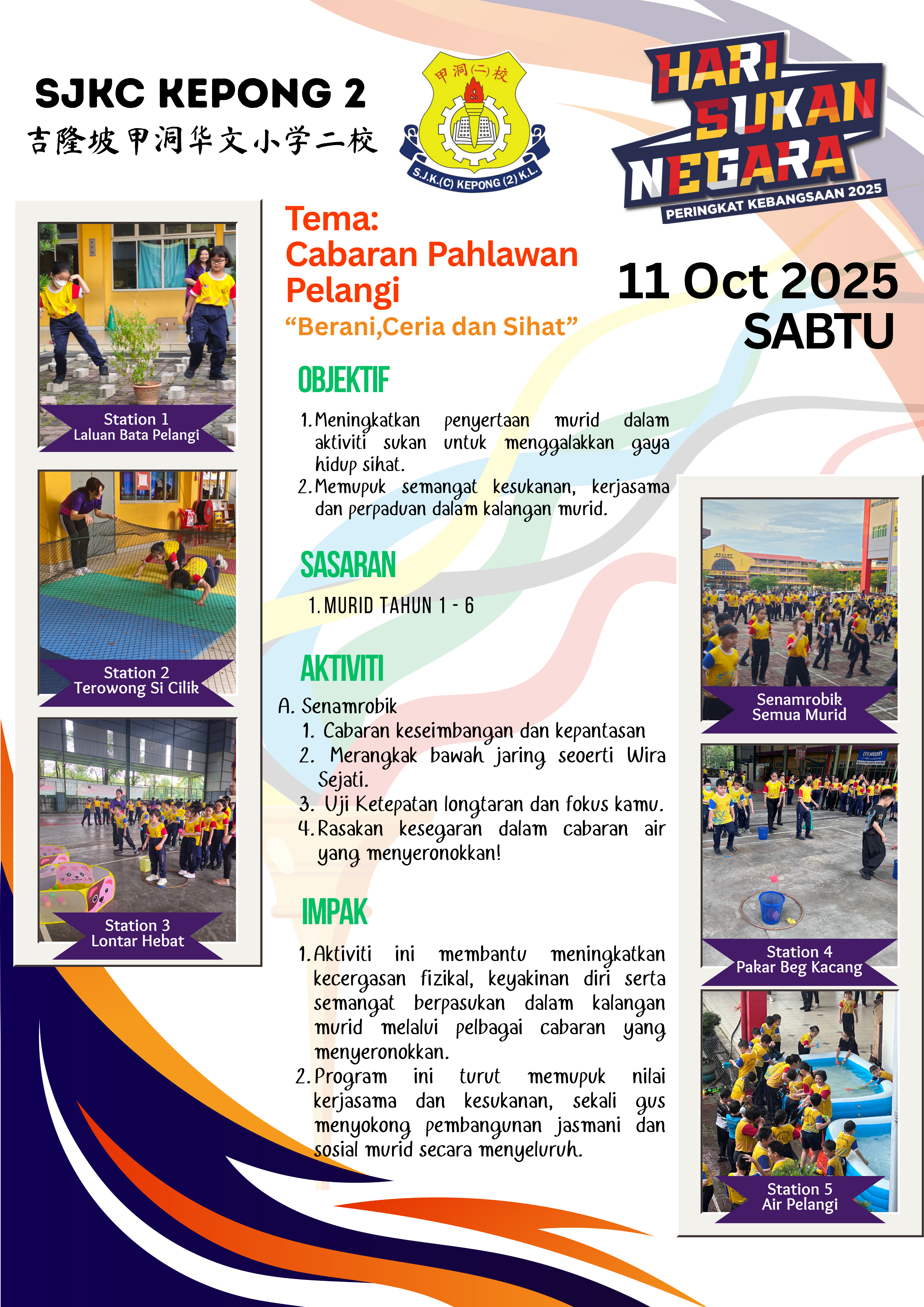 Cabaran Pahlawan Pelangi Aktiviti “Cabaran Pahlawan Pelangi” merupakan satu program sukaneka yang dirancang bersempena Hari Sukan Negara bagi menggalakkan penyertaan aktif murid dalam aktiviti fizikal secara menyeronokkan. Program ini menampilkan beberapa stesen permainan seperti Laluan Bata Pelangi, Laluan Merangkak Berani, Cabaran Beg Kacang Pelangi, Zon Air Pelangi, serta pelbagai aktiviti lain seperti melompat, merangkak, melempar, memanjat dan menembak. Melalui setiap cabaran, murid dapat mengasah kemahiran motor halus dan kasar, meningkatkan kekuatan fizikal, serta membina daya tahan mental dan keyakinan diri. Selain itu, aktiviti ini turut memupuk nilai murni seperti kerjasama, semangat kesukanan dan disiplin dalam kalangan murid. Secara keseluruhannya, “Cabaran Pahlawan Pelangi” bukan sahaja menyeronokkan tetapi juga menyokong usaha ke arah pembentukan murid yang sihat, aktif dan bersemangat tinggi.